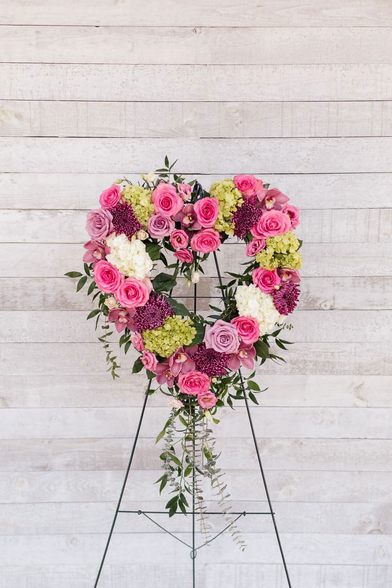 Cet arrangement funéraire en forme de cœur se présente dans des teintes mauves, roses, blanches et vertes. Très populaire, ce cœur témoigne d’une douceur paisible et surtout, intemporelle. Composé d’hydrangées, de roses, d’orchidées, de chrysanthèmes et de verdures, il est un symbole de sérénité et de beauté.